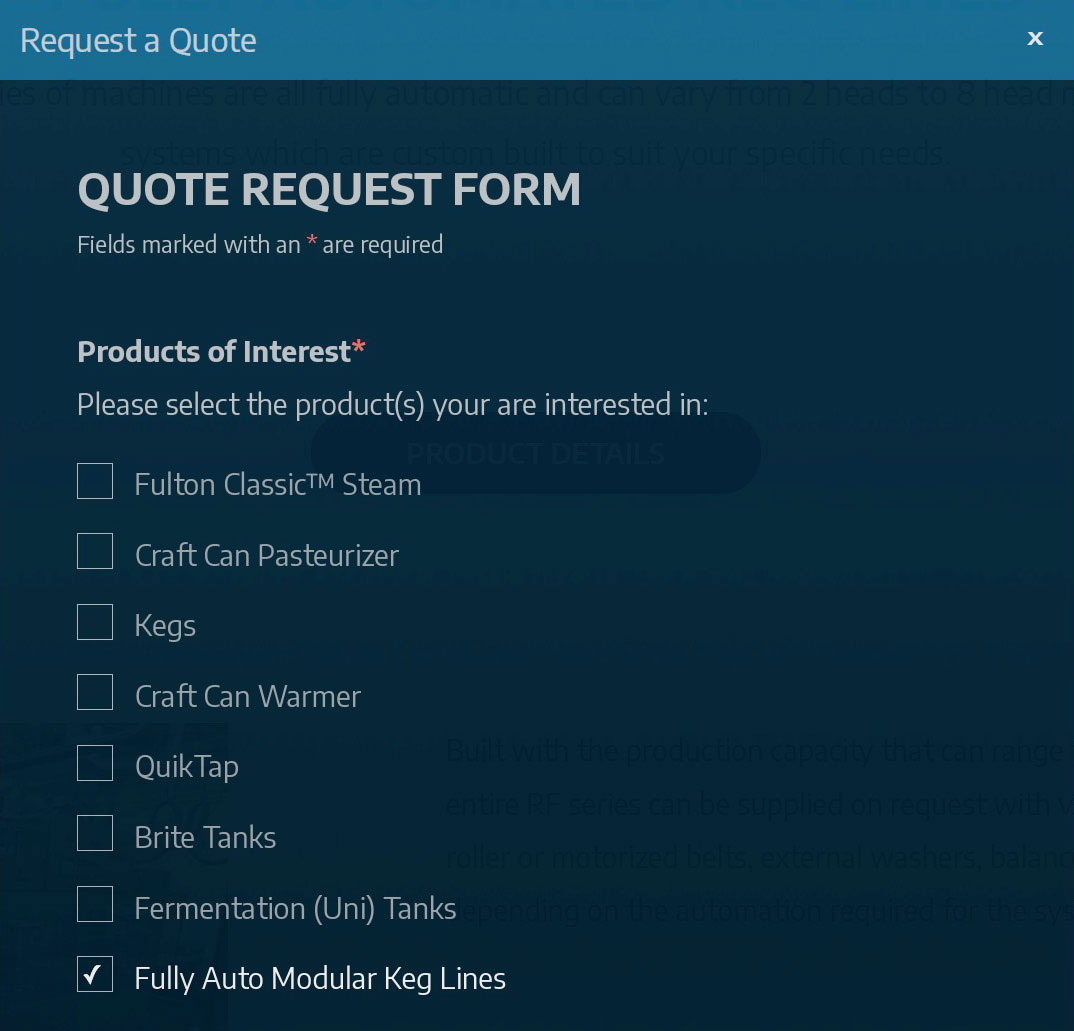 Every product published as a content item on the website would dynamically appear on the quote request form as a checklist item. The visitor would use the checklist input the specify their products of interest.