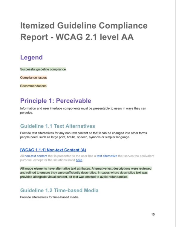 These issues can include things like words or phrases in additional languages [WCAG 3.1.2], or mixed media content requiring descriptive text due to it’s content [WCAG 1.2.3]. Recommendations addressing the issues were included in the report.
