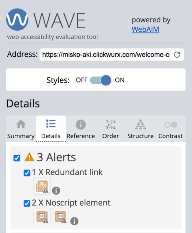 WAVE is a popular tool for performing website accessibility audits. The tool was used towards the end of the development phase to do the initial sweep for accessibility conflicts.